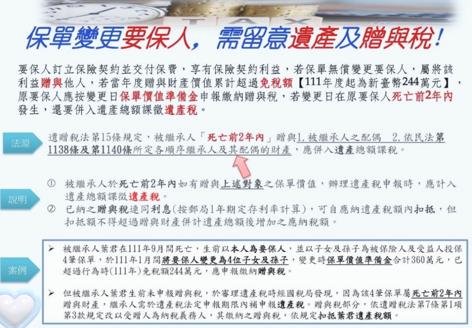 民眾辦理親人遺產稅申報時,請先檢視被繼承人死亡前投保保單,如有以被繼承人為要保人,死亡前2年內變更該保單要保人為被繼承人之配偶、直系血親卑親屬、父母、兄弟姊妹、祖父母及各順序繼承人的配偶時,應按被繼承人死亡日該保單價值併入被繼承人遺產申報,以免因漏報遭到補稅及處罰。