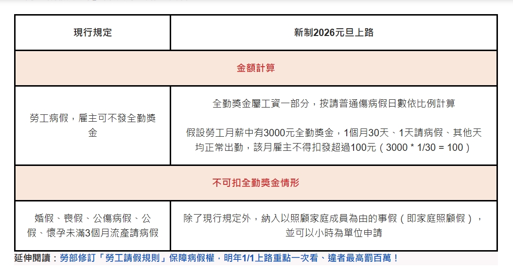 新規定: 雇主扣發全勤獎金必須 「按比例計算」!請幾天假就扣幾天的比例,不能一次全部沒收!剩下的獎金還是你的!, (當然,如果你們公司原本就不扣全勤,那就維持原本更優的福利喔!)