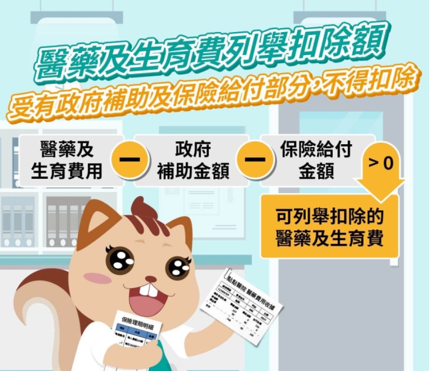 國稅局提醒民眾申報綜合所得稅時,列報本人、配偶或受扶養親屬的醫藥及生育費,若先前受有保險給付,應自醫藥及生育費中予以減除,依照減除後的餘額列報扣除。